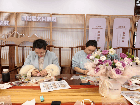 随后,活动进入 “锦承芳华”巧手织锦环节。女教职工们在现场慢享温柔手作时光,沉浸式体验宋锦饰品制作的乐趣。大家先撷取宋锦经典的云纹、缠枝纹纹样,裁丝缕、缀微光,精心制作专属的芳华挂件,让宋锦的细腻纹理映衬独有的温婉气质;再以多彩锦绳为引,串联亲手制作的锦饰,用心编织锦心锦绳,将手作的温度与非遗的厚重紧紧相融。指尖翻飞间,一块块精致的宋锦化作方寸间的美好,大家将春日芳华与节日心意藏于饰品之中,在动手实践中感受非遗制作的匠心,更在沉浸式体验里收获悦己的美好。