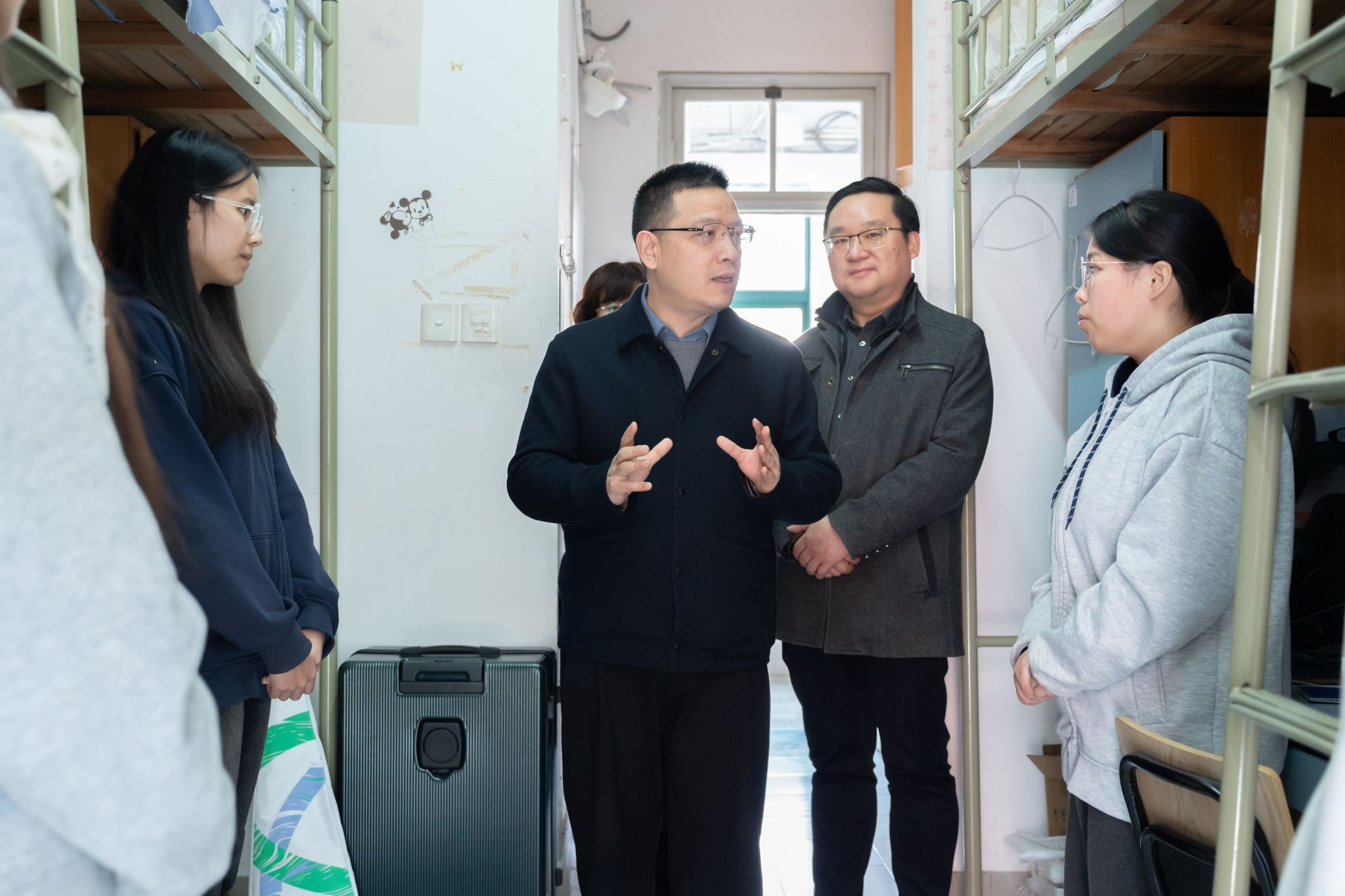 座谈会前,贾文胜一行还前往学生公寓走访,并与所联系的学生进行亲切深入的交流。在学生公寓,贾文胜仔细查看了寝室住宿环境、安全设施配备情况,详细询问了同学们新学期的学习安排、生活状况与未来发展规划,反复叮嘱同学们要时刻绷紧安全之弦,严格遵守寝室安全管理规定,养成良好的生活习惯,共同营造安全、整洁、和谐、向上的寝室氛围。